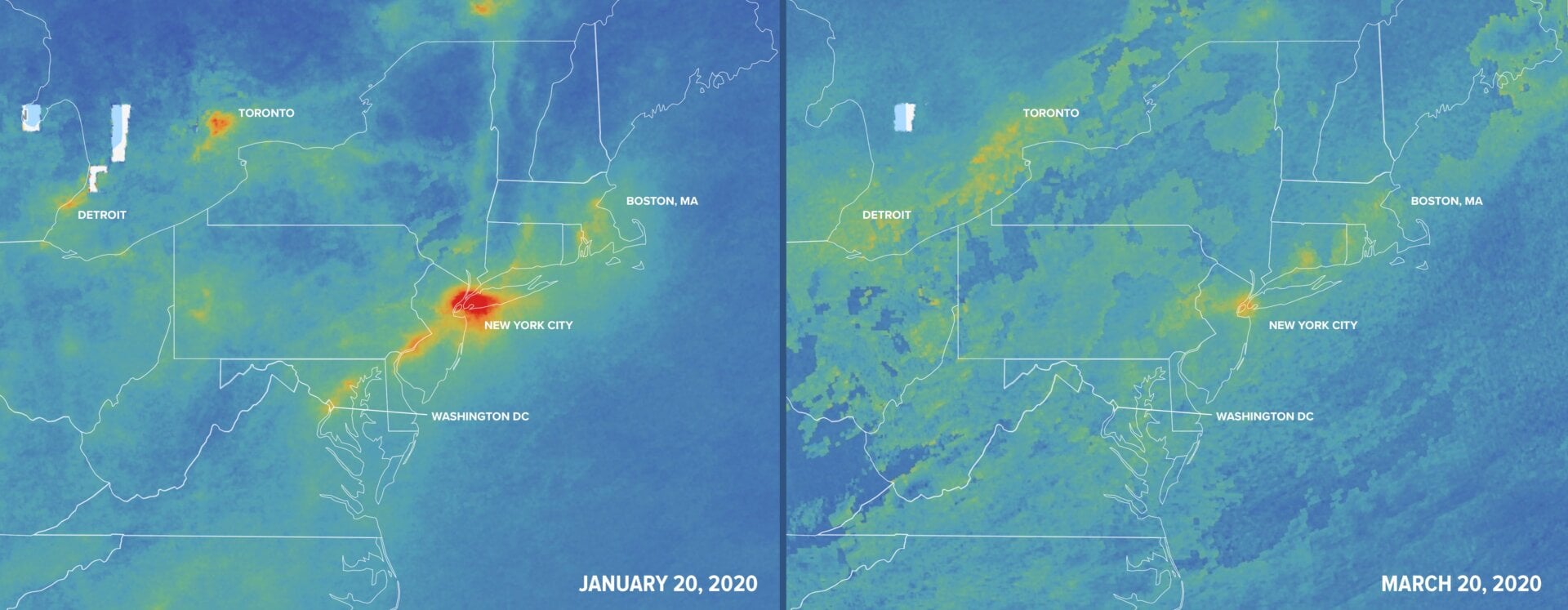 Though New Yorkers aren’t as car-dependent as their Los Angeles counterparts, there are still plenty of vehicles normally on NYC roads and dense clusters of buildings emitting pollution. Ditto for Boston, Philadelphia, Baltimore, and Washington, which normally form a daisy chain of pollution along Interstate 95. With covid-19 lockdowns, the chain has been broken.