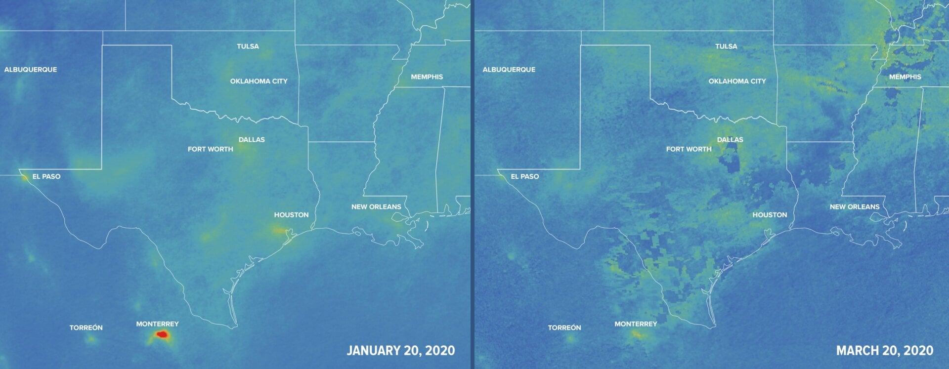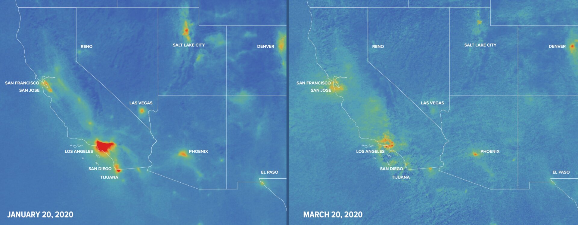 The impacts extended across the border as well. Tijuana—which is intimately linked to San Diego—saw pollution dissipate to practically nothing. Ditto for El Paso and Juarez visible further east. The Mexican and American governments have agreed to partially close the border in an effort to stop the spread of covid-19.