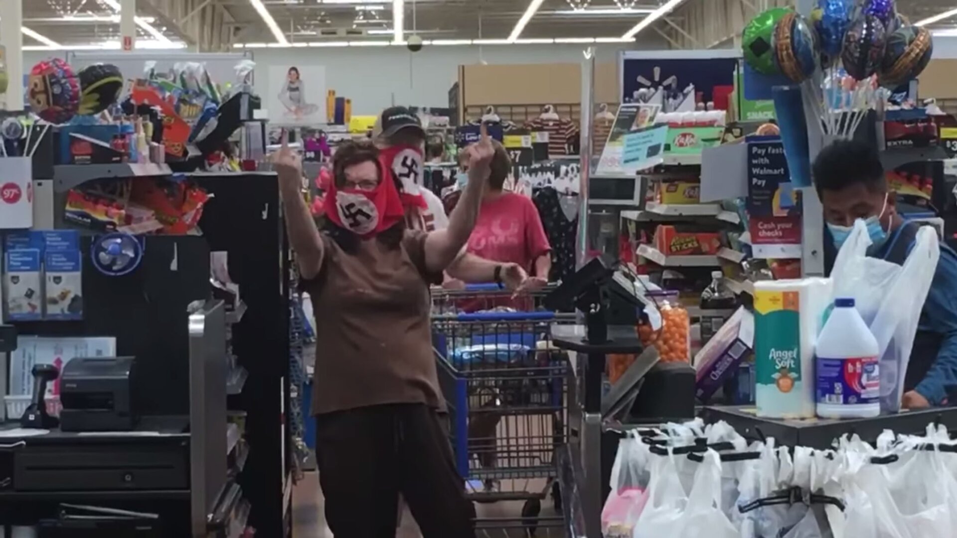 Then, there’s the people who actually try to turn it into a political statement in all the wrong ways. Case in point: yesterday, Minnesota resident Raphaela Mueller snapped a now viral video of two Walmart shoppers who responded to the chain’s mandatory mask policy by wearing masks featuring the Nazi flag. When Mueller’s partner, Benjamin Ruesch, called the pair “sick,” they flipped him off.