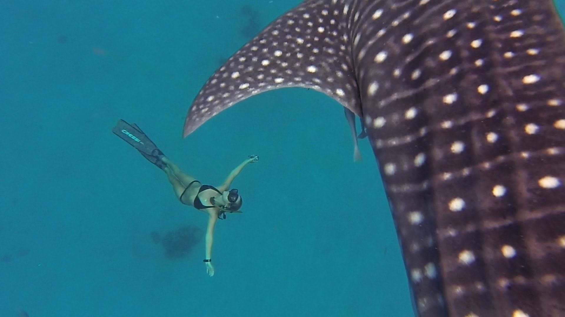 Lucky for shark biologist Ocean Ramsay who’s swimming alongside this one, whale sharks are filter feeders. Rather than gnash into prey like their relatives, they act like living vacuums, sucking in water and whatever edible material comes along with it. Water gets expelled, food bits stay trapped, shark stays happy.