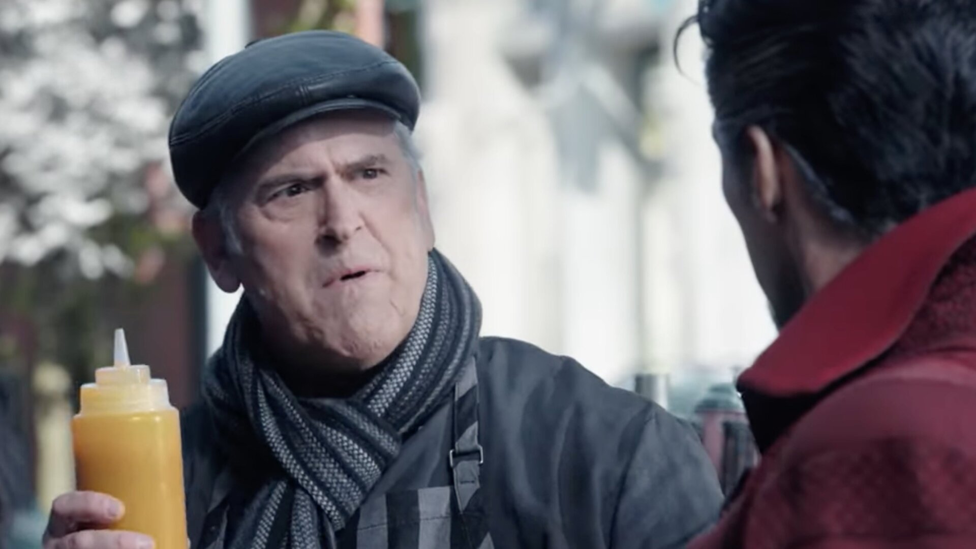 Yes, it’s Pizza Poppa, played by Strange director Sam Raimi’s friend and favorite punching bag Bruce Campbell. If you don’t recall the scene, as Strange and America Chavez (Xochitl Gomez) travel through Earth-838, America grabs a slice of pie from a stand and is accosted by its owner, Pizza Poppa, for not paying. It’s a legitimate complaint, frankly, as is Poppa’s suggestion that this person walking around in Doctor Strange’s cloak—it being a world where Strange has died—must have stolen it from a museum. When the MCU’s Strange tells Pizza Poppa to back off, the Poppa gets ready to squirt mustard on what he believes is an imposter and a thief, only for Strange to magically cause Poppa to squirt the mustard in his own face and then begin punching himself in the face… for three weeks.