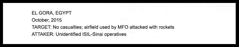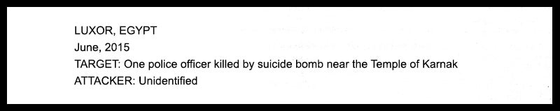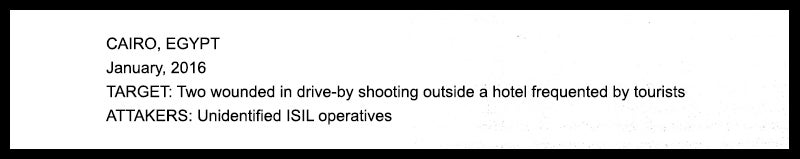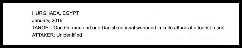 45. Again, it’s unclear what the White House is attempting to describe: Three people—two Austrians and a Swede—were stabbed at a resort in Hurghada on January 8, and the perpetrator was killed. Trump tweeted this, on that day: