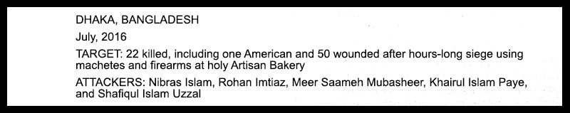 58. On July 1, 22 people were killed—including one American—and 50 wounded in an hours-long siege in Dhaka, Bangladesh. Trump did not bring any attention to this, although he did send several tweets about an American girl killed in Israel by a “Palestinian terrorist.”