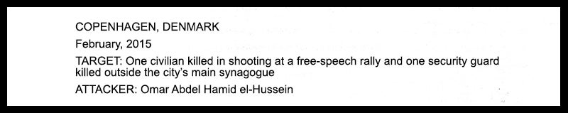 65. The White House list also includes a September shooting in “Denmakr”, which we’ll take to mean the August 31 shooting in Denmark, in which two police officers and a civilian were wounded. The attacker was killed, and ISIS has claimed responsibility, but the incident may have been drug related. In any case, Trump was thinking about other things: