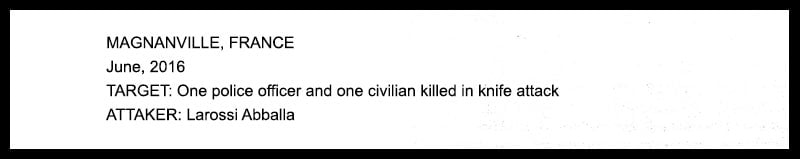 55. On June 13, one police officer and one civilian were killed in a knife attack in Magnanville, France. Trump: