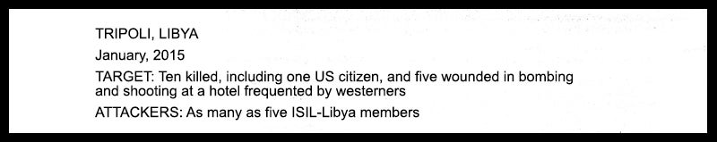 11. On January 27, five ISIS-Libya militants killed ten people, including one U.S. citizen, in a Tripoli hotel popular with Westerners. Trump had nothing to say about it. He did say this, though: