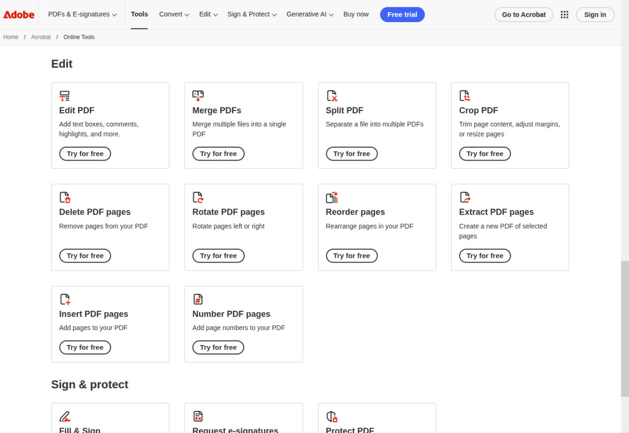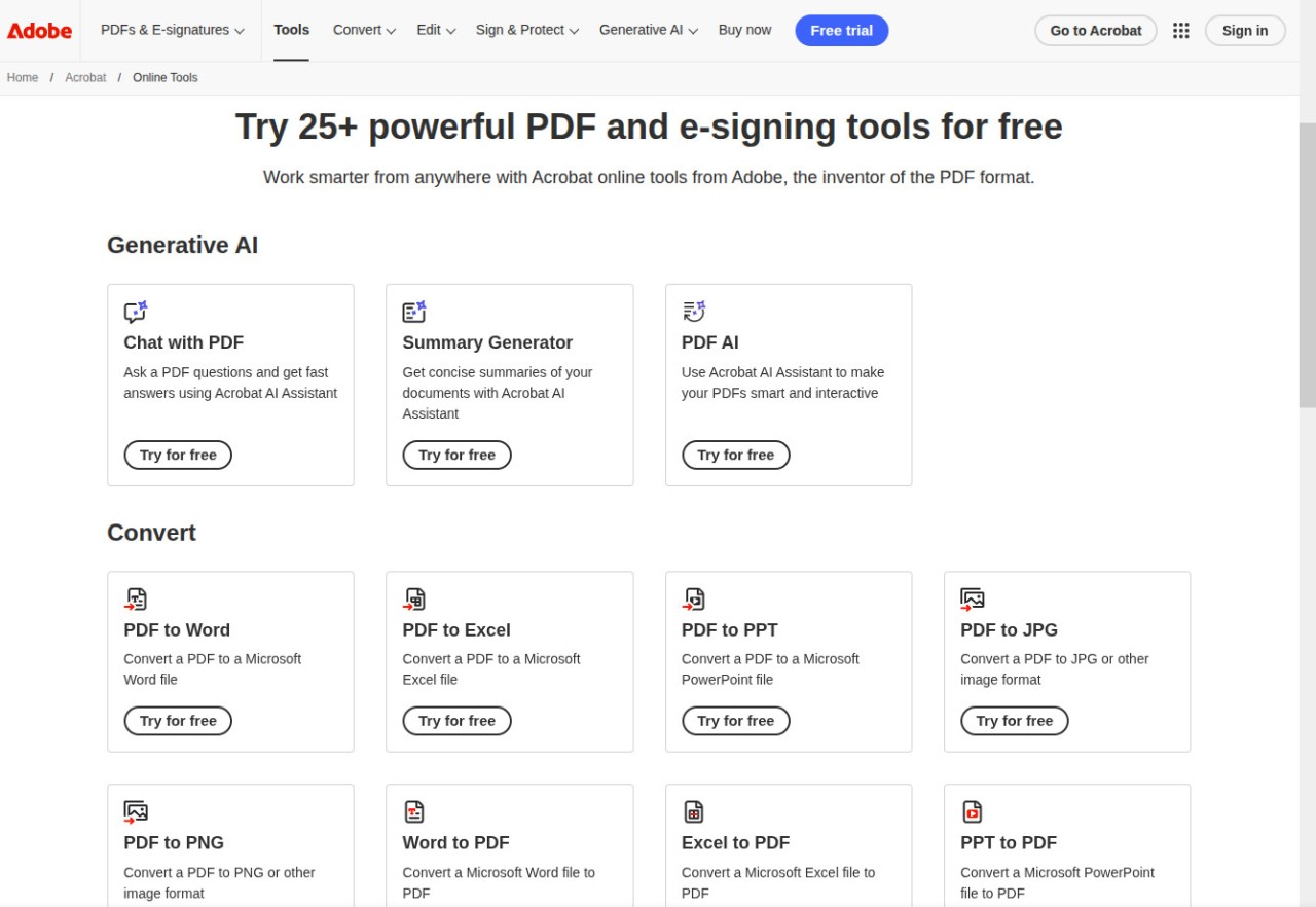 Each tool lives on its own page, so you pick the task, upload your file, and get the result without hunting through menus or figuring out a complex interface. Conversions between PDF and Office formats tend to hold their formatting well, and compression does a solid job of shrinking file sizes without turning your pages into a blurry mess. For anyone who works with PDFs occasionally but does not want to pay for or download a full desktop editor, Adobe Acrobat Online covers a lot of ground.