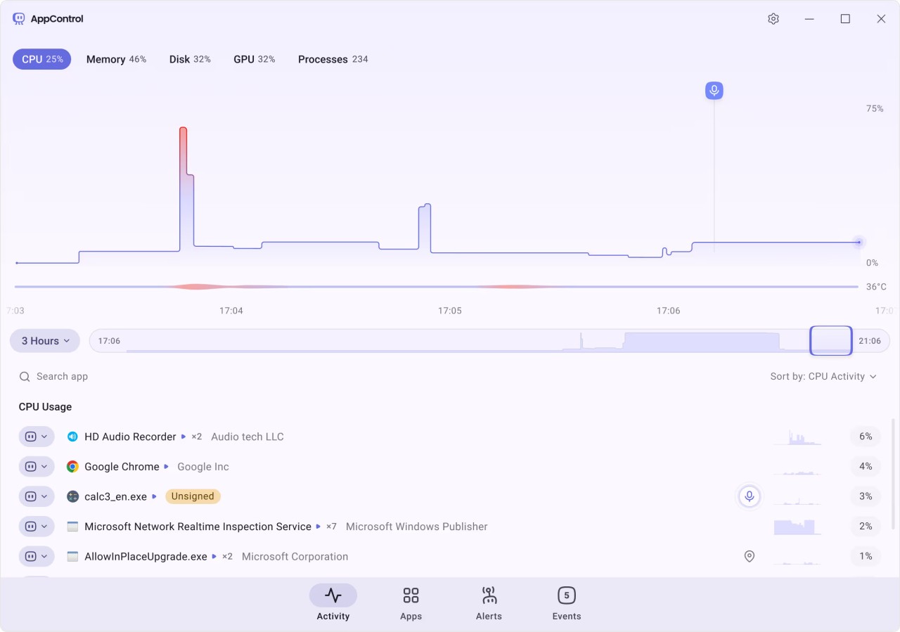 AppControl keeps track of the security of your computer system. You can get notified when your hardware, like your microphone or camera, is in use. All suspicious applications and programs will be met with the same fate, as AppControl tries to keep your computer free of malware.