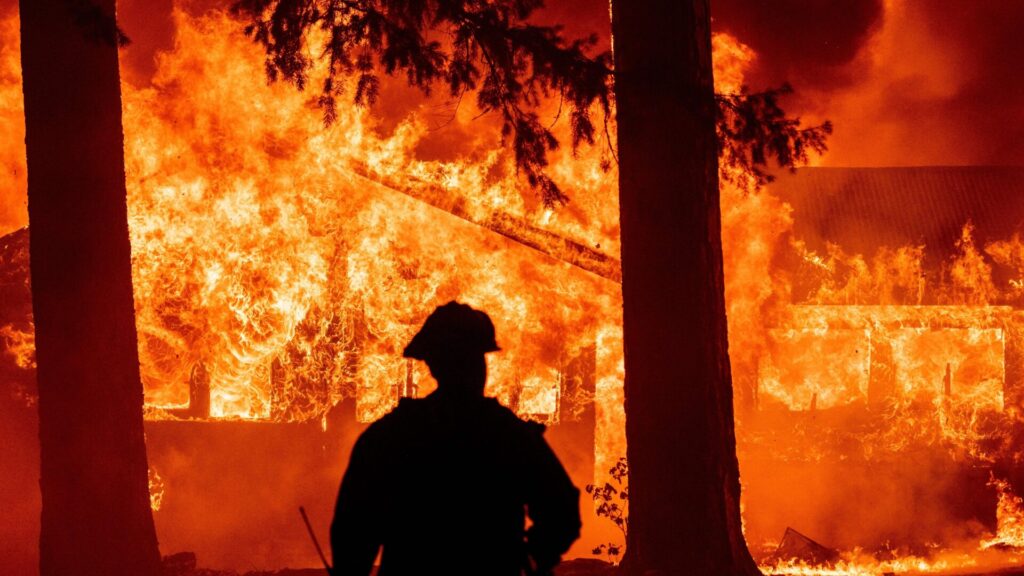The blaze has burned down two dozen structures and forced more than 16,000 people to evacuate.