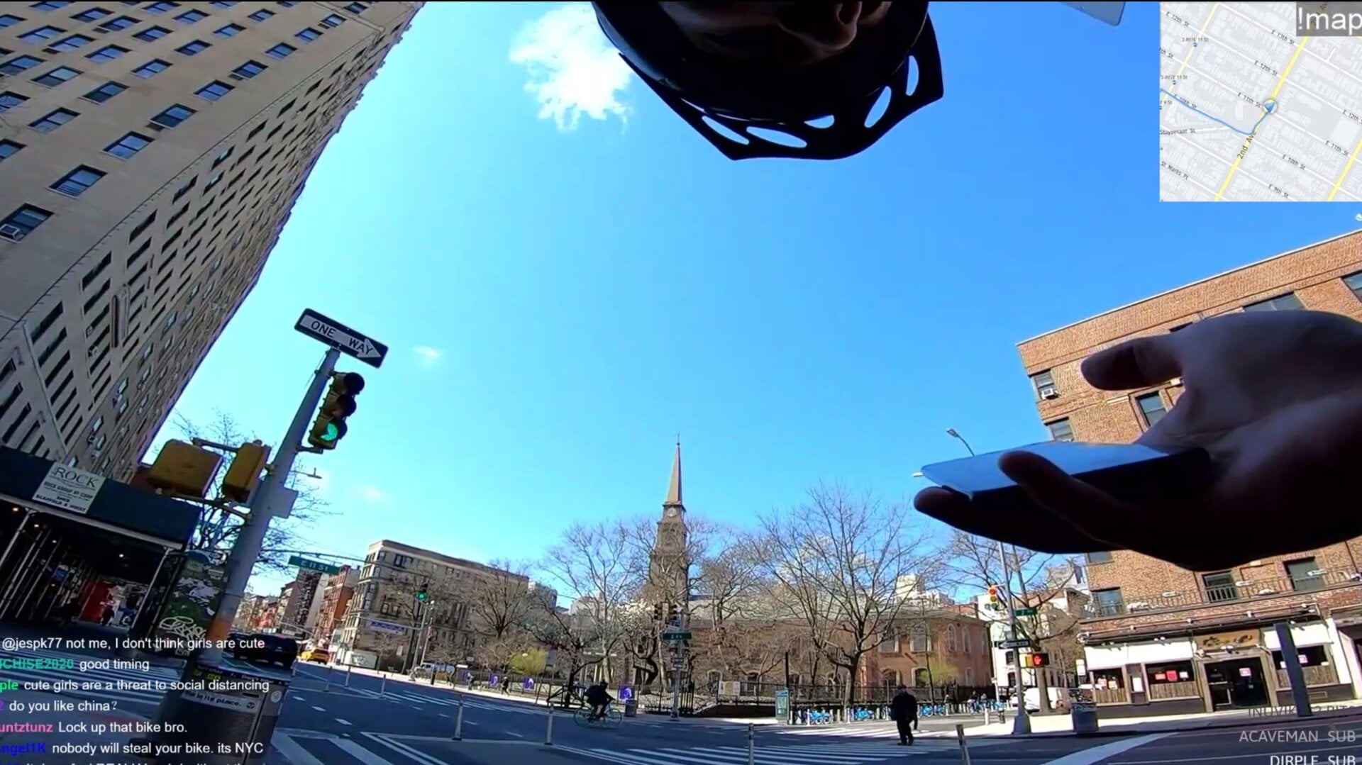 I stan Michael the 26-year-old NYC bike messenger, who might never become the city’s mascot (the politics of New York City’s three-way cold war between pedestrians and motorists and bicyclists are divisive enough before factoring in livestreaming), but embraces the workday with verve and Queen. Viewers from around the globe tuned in to watch him make his rounds yesterday, as he remarked on how strange it was to cruise through the typically gridlocked 6th Avenue West Village intersection (he actually loves the crowds, he says), and no lines at Faicco’s, where, from his camera, you can glimpse a five-person-capacity sign on the window.
