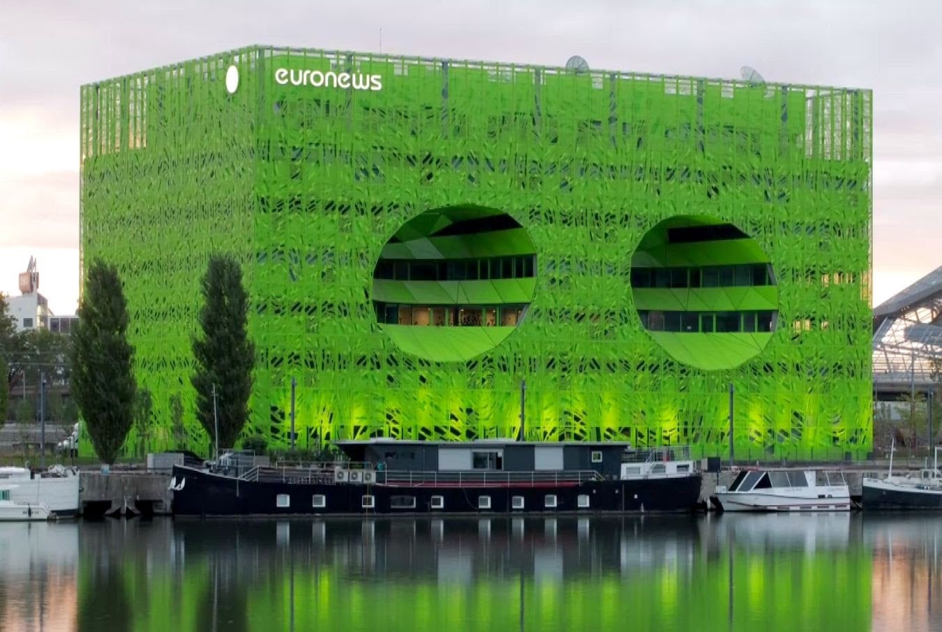 Euronews has about 800 staff in Lyon, now they have a total of 10,000 square meters working space—multimedia offices, high-tech facilities, and studios—across six floors. The following video shows the main characteristics of the vibrant green cuboid building: