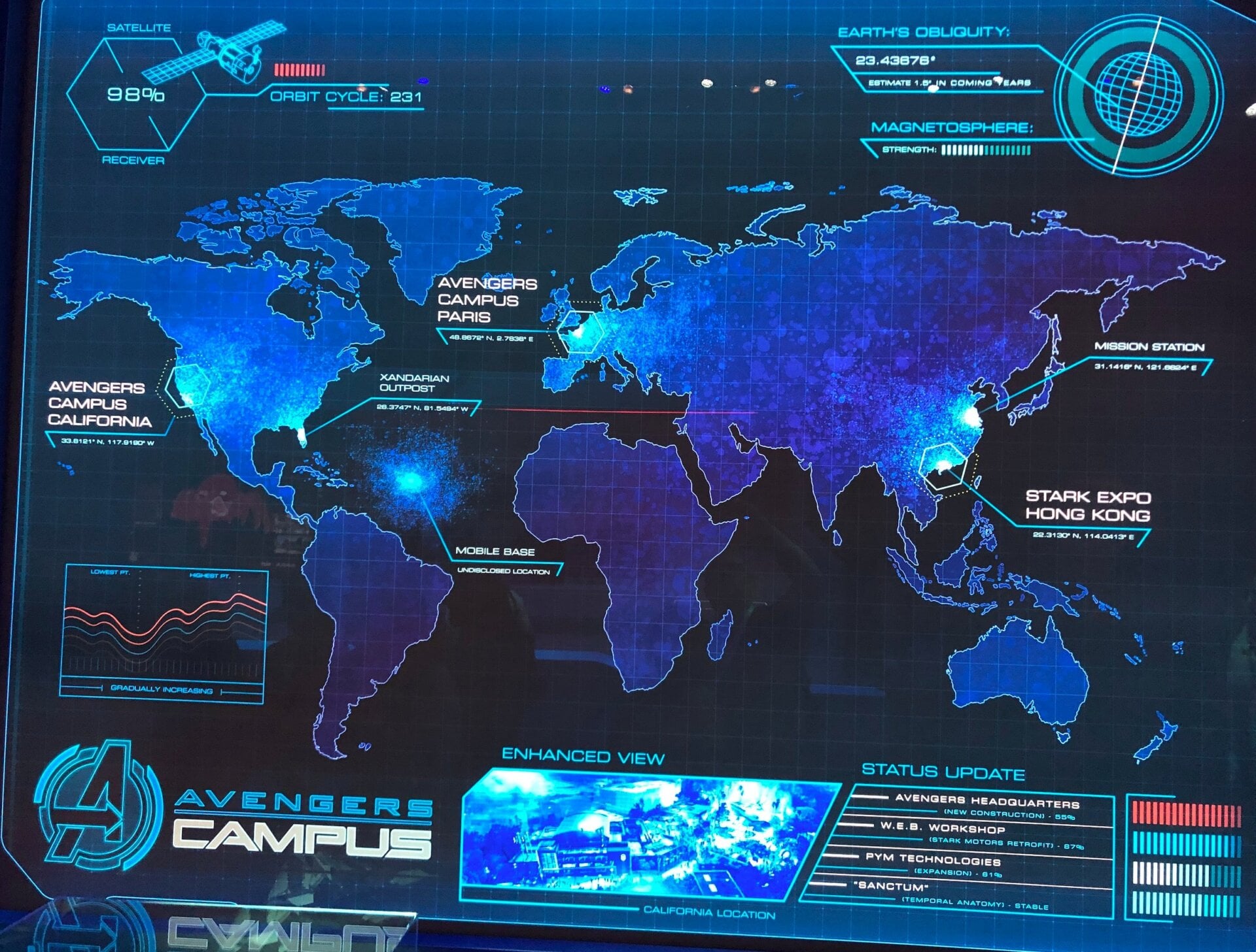 The idea behind Avengers Campus is that the Avengers have set up places all over the world to recruit special people to join their ranks. Special people like…everyone who visits a Disney park. The theming will tie together other Disney theme parks all over the world that already have Marvel rides such as Paris and Hong Kong. Here’s a world map to explain.