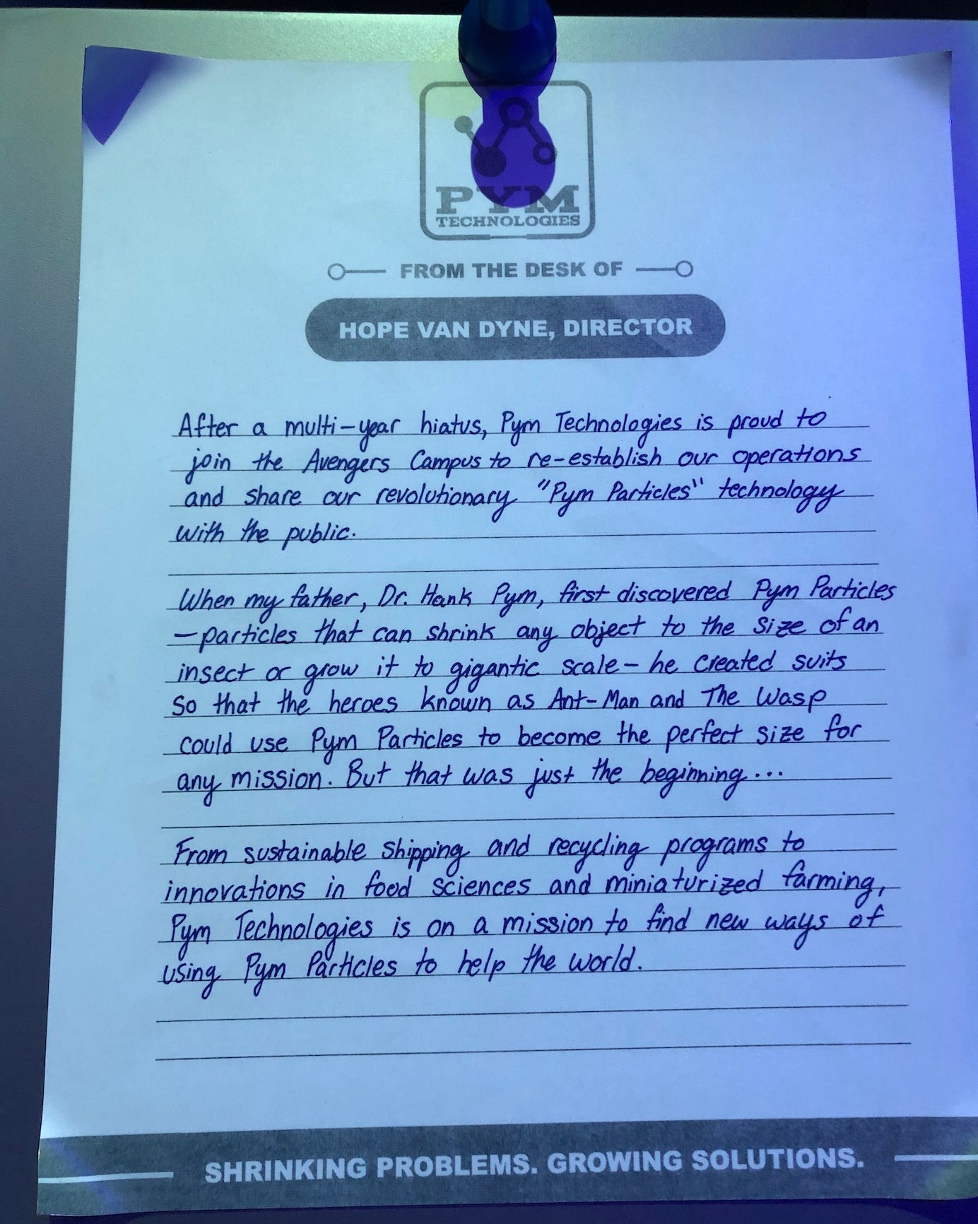 There’s also some kind of Pym Tech space at Avengers Campus. Here’s a note Hope Van Dyne wrote about it.