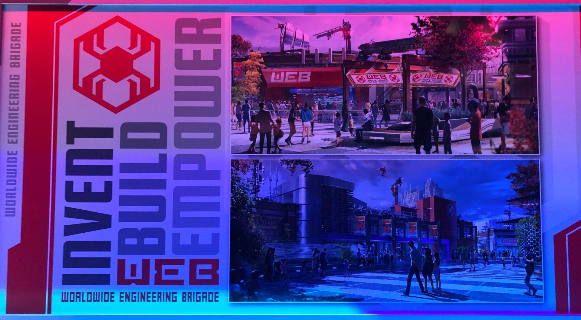One of the question marks, though, is the W.E.B. Workshop. What’s that? Well, we think (though it was not confirmed, the big reveal is being held for Sunday’s theme park panel) that it ties into the main Spider-Man themed ride at Avengers Campus California, which you see in the concept art in the far left side.