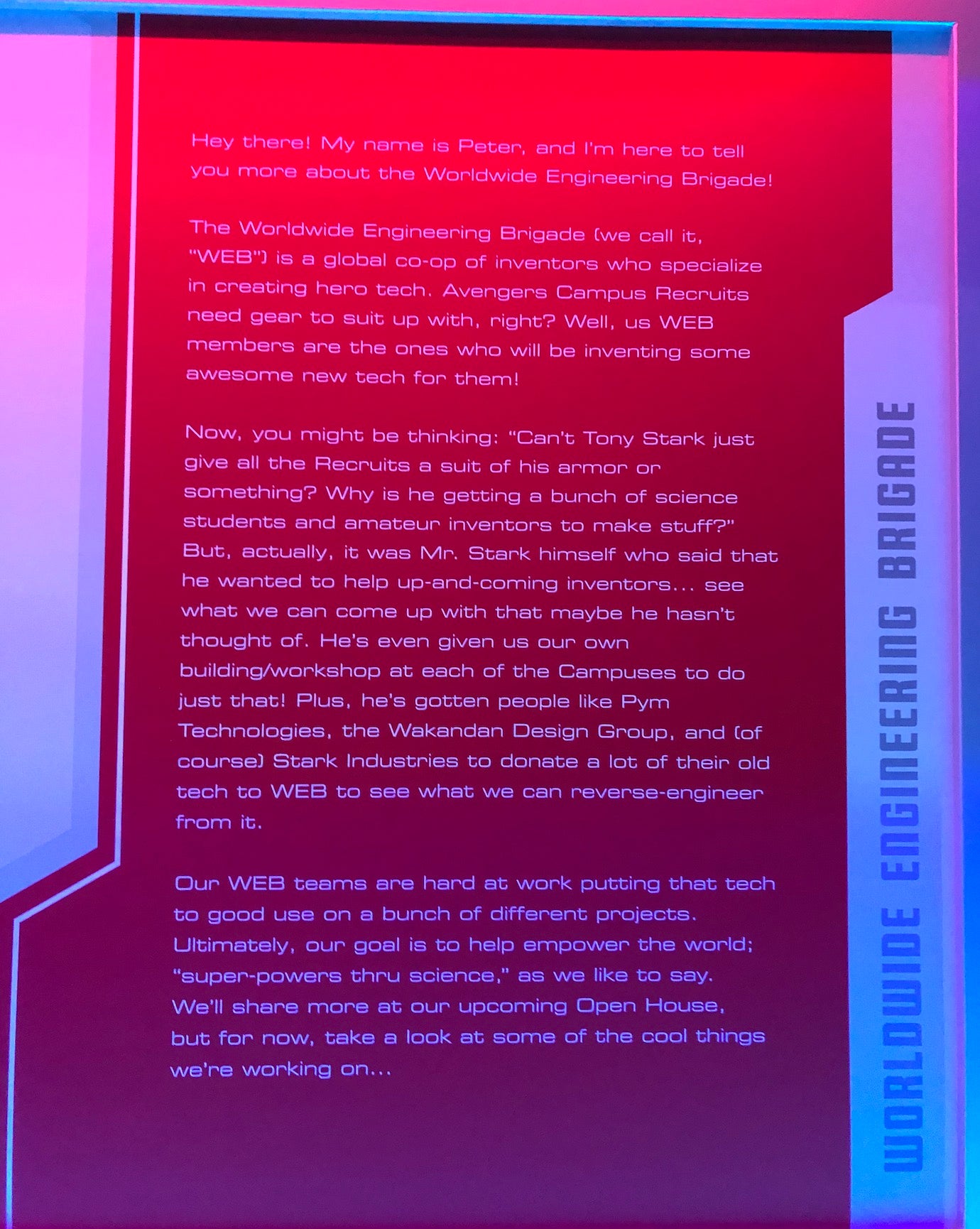 Here’s a note from Peter Parker explaining the initiative, which is the “Worldwide Engineering Brigade.”