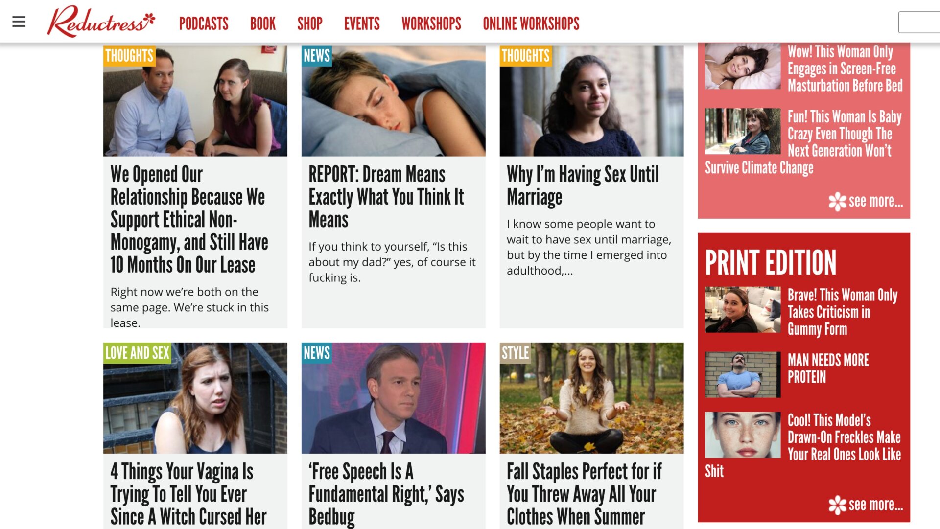 Upon first glance, Reductress stories look like the kind of, well, reductive posts that content mills churn out with the aim of infesting Facebook. Classic Reductress examples include “What Surprised Me Most About Becoming a Parent Was That I Was Forced To by The Government,” “How to Make Your Vagina Look More Like His Man Cave,” and “Dying Woman Finally Achieves Body Acceptance.” It seems Facebook—or its algorithms at least—mistook headlines like that for real clickbait drivel.