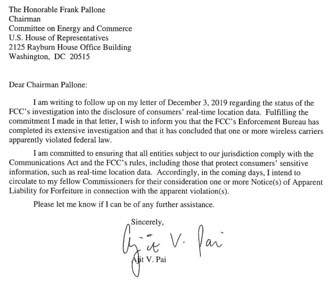 In letters addressed to oversight lawmakers on Friday, FCC Chairman Ajit Pai announced that his agency’s nearly two-year investigation into the unauthorized sale of consumers’ phone location data had finally come to an end.