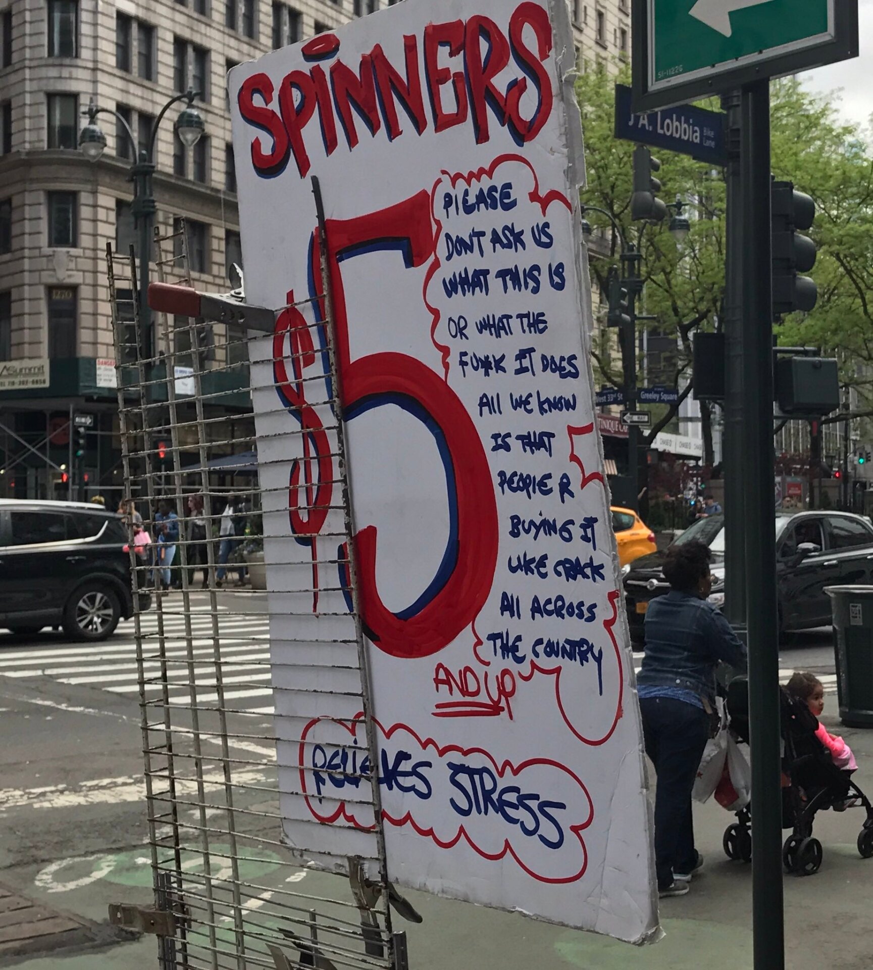 As I set out and walked up Lafayette Street (as opposed to the adjacent and far more crowded Broadway, to avoid being seen) I flicked it, successfully getting it to spin every other time (one of the three spokes frequently smacked into my fat thumb). I shamefully hid it in my pocket three times on a thirty minute walk uptown—once as I made eye contact a lanky college-aged guy in a rainbow bomber jacket and bleached hair near NYU, and another as I walked by an especially chic-looking woman in a big hat in Madison Square Park. But most notably, I saw some mother scowling as her two young children begged her to buy them their own spinners near Union Square. I wanted to throw mine away when I thought about how dumb I looked, a grown-ass adult flicking a popular children’s toy on a busy sidewalk. But you should have seen the elementary school-aged daughter’s poise while balancing a rainbow spinner on her tiny thumb.