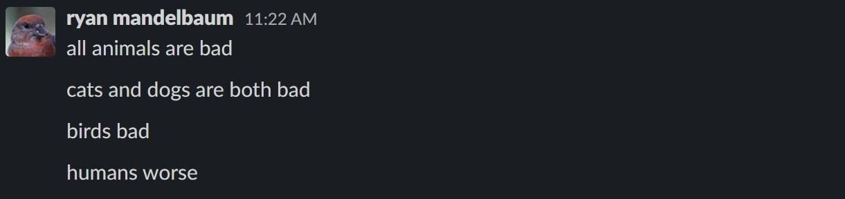 Ryan once found a dead bird coming to work, bagged it, and left in the office freezer. It was for good cause (science, of course), but nevertheless sparked the last great meltdown in our office Slack channel shortly before said office closed due to the pandemic. Thank you for that, Ryan.