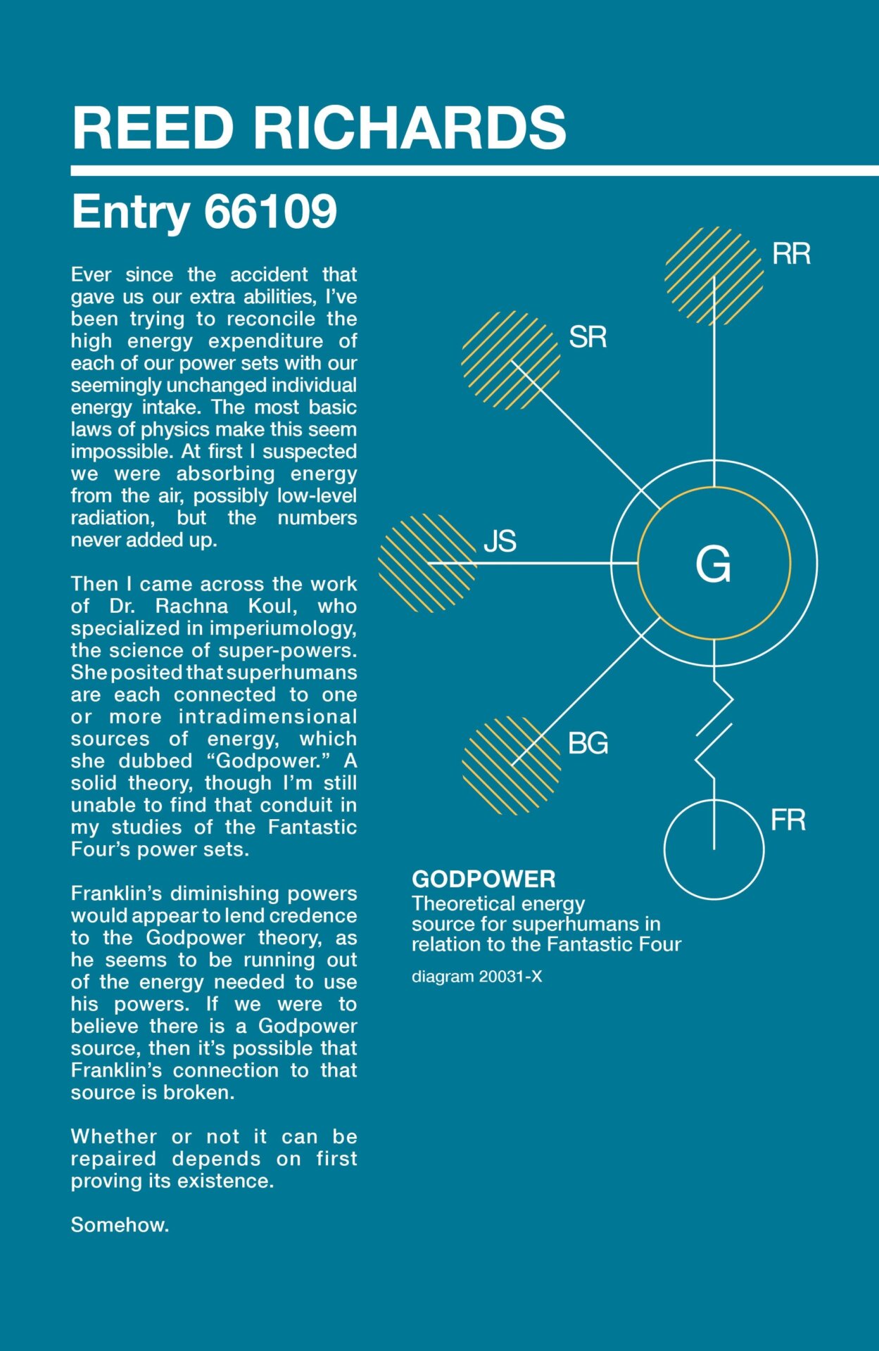 Reed’s notes describe how, in his studies of the Fantastic Four’s power sets, he’s determined that the amount of energy they all put out vastly dwarfs the amount of energy they all consume as humanoids, meaning that all of that power has to be coming from somewhere. If Koul’s theory proves to be true in regards to the Fantastic Four’s powers, it could be expanded to include the idea that children like Franklin born to parents with one or two of their own connections to this “Godpower” would naturally have more or stronger connections to the energy, which might explain why the kid’s been able to do so many different things. The theory would also provide Reed a way to heal his son should he devise a way to restore his connection to the Godpower.