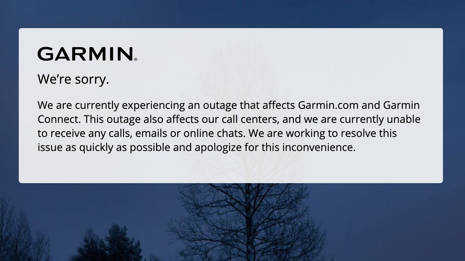 The outage was first reported by ZDNet, which noted that Garmin is planning to run maintenance over the issue over multiple days. The company shared a statement both on its Twitter and website, which said that Garmin is “currently unable to receive any calls, emails, or online chats.” ZDNet also noted that the outage impacted flyGarmin, a web service that pilots use to support Garmin’s aviation navigation devices. Pilots also told ZDNet that they were unable to download Garmin’s aviation database or access the Garmin Pilot app, which helps them to schedule and plan flights.