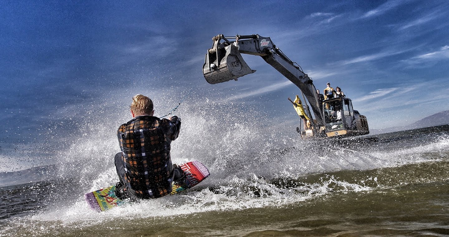 Getting dragged on the water by a giant excavator is a fun way to surf