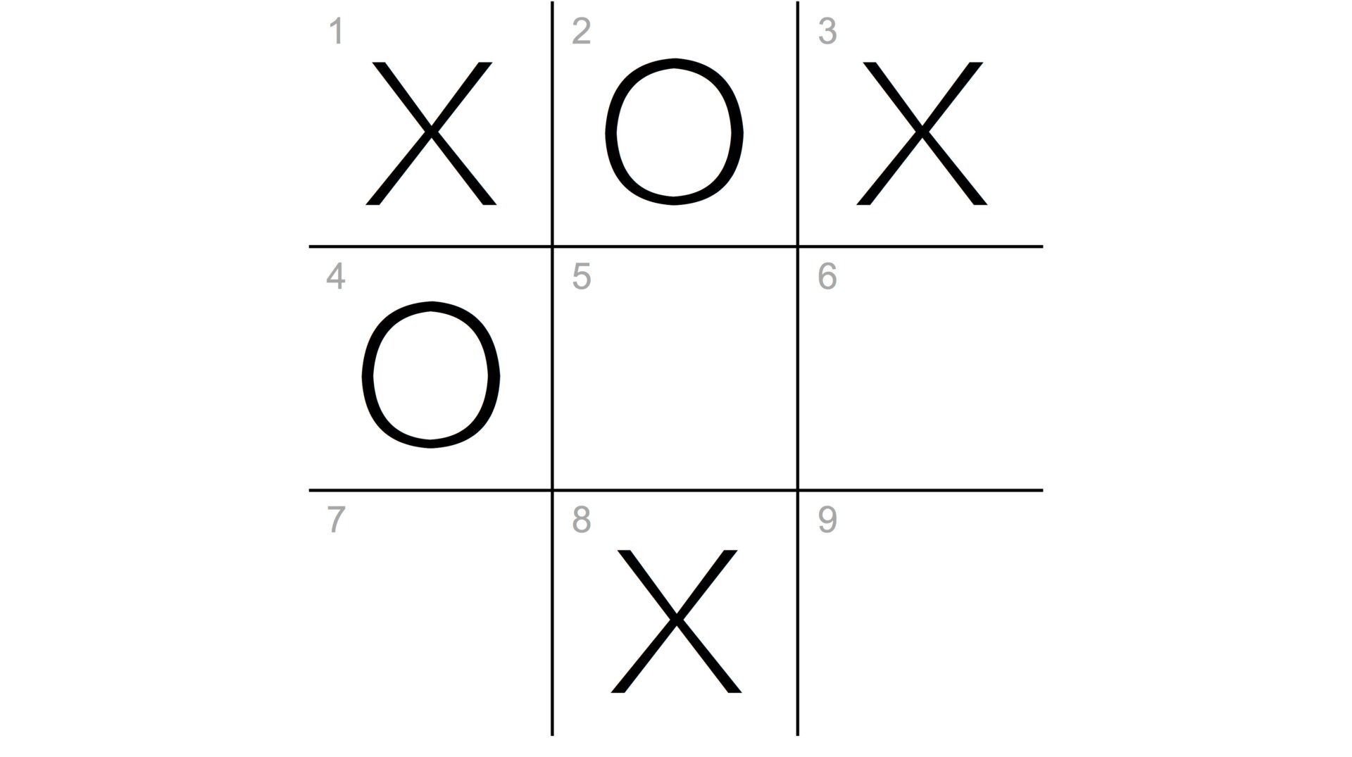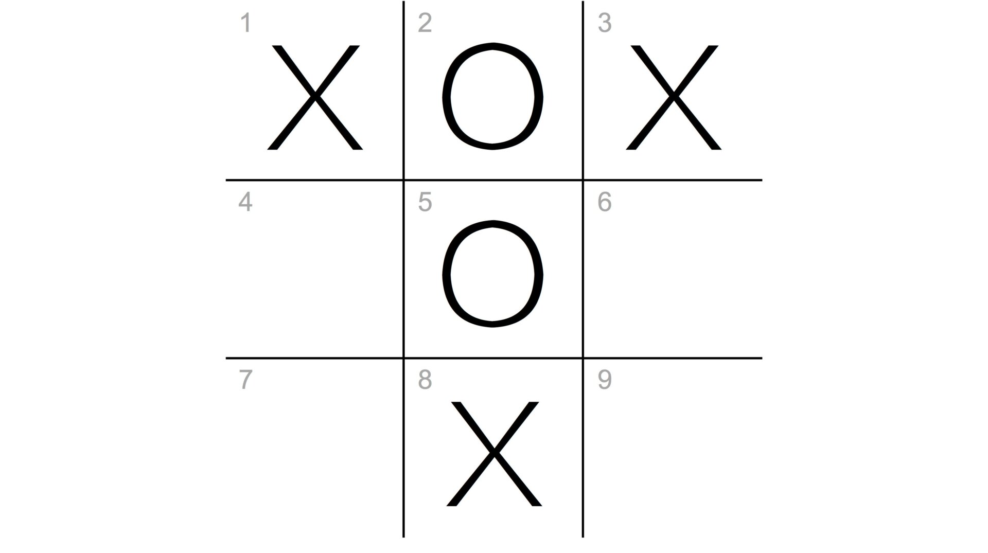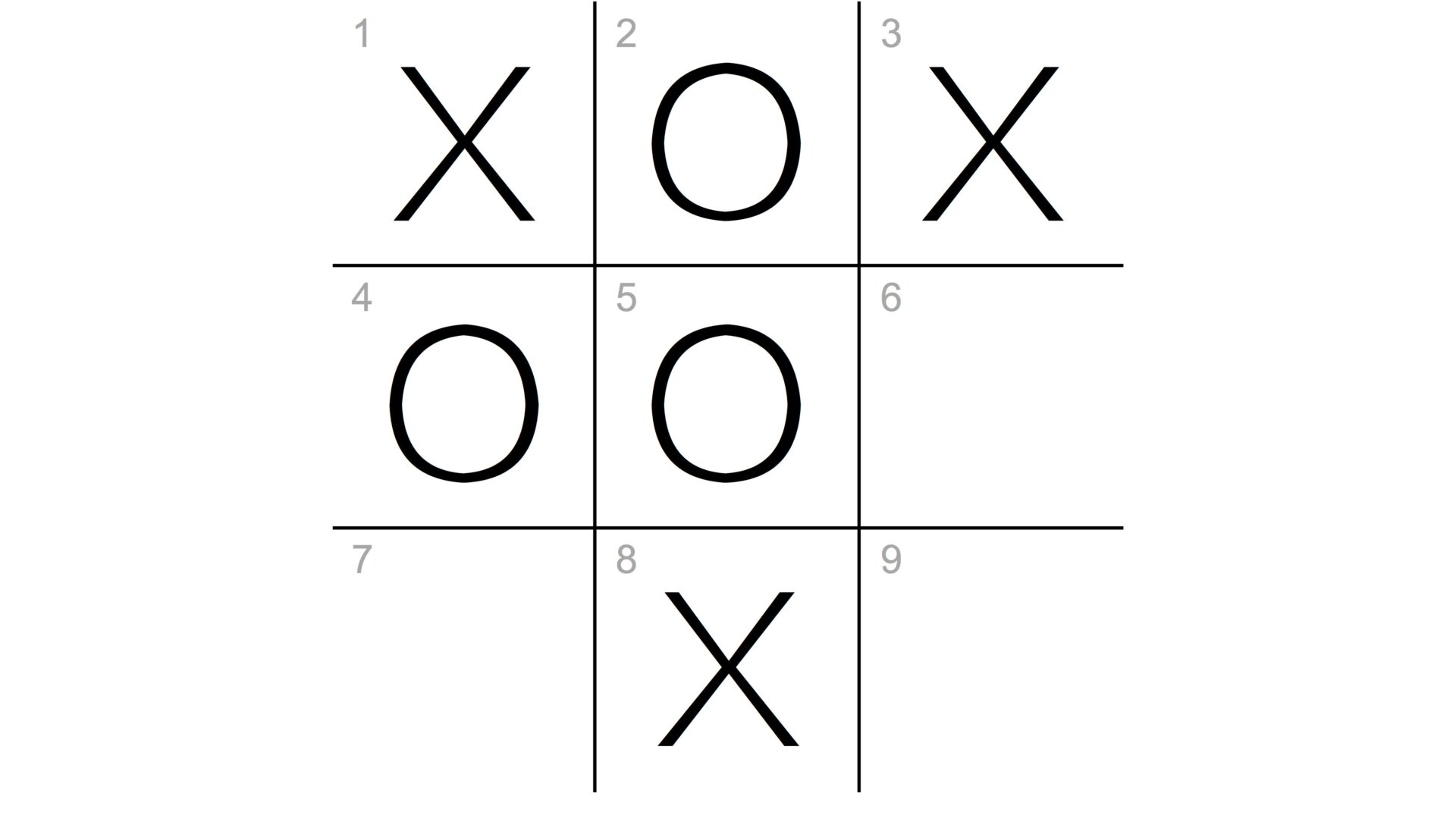 Now, what was O’s last move? It was not cell 2, because playing in cell 6 instead would have won. So O either played in cell 4 or 5. Determining which requires us to take two more steps backward. Suppose O just played in cell 5. This means the position looked like this, with X having just played: