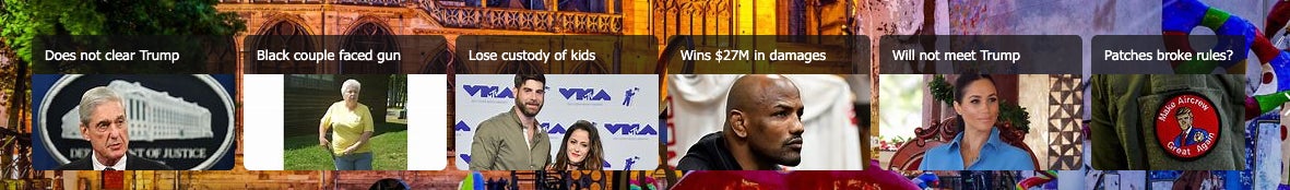 Did you know Bing aggregates news, too? Not especially well, though, and its headlines are seemingly compiled robotically, which results in fragments of nonsense often paired with mismatched images. “Black couple faced gun” shows a photo of an old white lady; “Lose custody of kids” would read as a bizarre command if not for its proximity to two people (celebrities?) I do not recognize. These do not point to any specific article but instead to a search—on Bing of course—saving you absolutely no time catching up on world events.