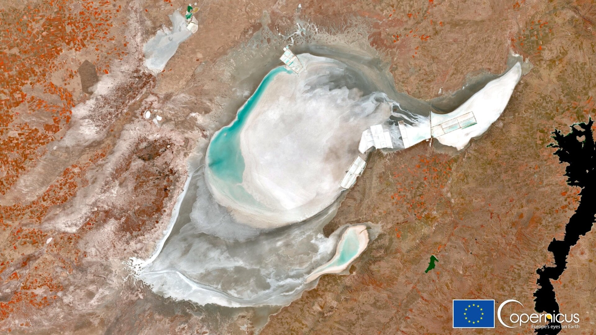 The image above, processed by the EU Copernicus Program, shows the state of Lake Tuz in its currently desiccated state. But before and after imagery really puts the dramatic transformation in context. The gif below uses the same Sentinel-2 satellite to show the lake in January of this year, when rain and snowmelt filled it to a beautiful light blue. Compare that to a stark image pulled from October 30, where the lake is almost entirely a snow-white expanse of salt.