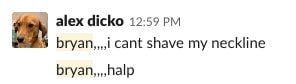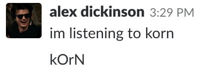 Here is a photo Alex with his favorite dog, and a screenshot of a slack message he sent me about his favorite band.