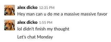 Hey Alex, I have some questions about a white mug with a round handle that I left in the office in 2017 but haven’t been able to find since. Because you’re not on slack anymore, can you just text me when you see this? Thx.