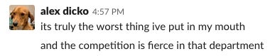 I sat next to Alex (I refuse to call him “Dicko”) for over a year and he is honestly one of the strangest people I’ve ever met. That said, I’m incredibly lucky to have worked with him and to call him a friend. I’ve seen Alex be cool and level-headed in the most insane situations when it would have been totally fine for him to flip tables. He went to bat for everyone, every day. This company, whatever it’s called now, is losing an A player. The only one benefitting from any of this is Clickhole, the only good website, as Alex will now have more time to read it.