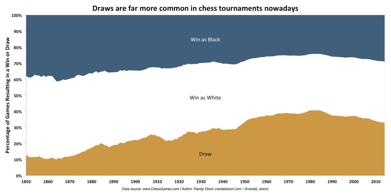 “Only 1 in 10 games ended in a draw in 1850, whereas 1 in 3 games ended in a draw in 2013,” writes Olsen. “The small dip in draws since 1980 looks promising, but it could very well just be noise.”