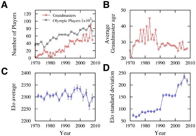 As the researchers point out in their study, the stability of chess since the 19th century “increased the game popularity and enabled players to work toward improving their skill. A consequence of these efforts is the increasing number of Grandmasters – the highest title that a player can attain – and the decreasing average player’s age for receiving this honor.”