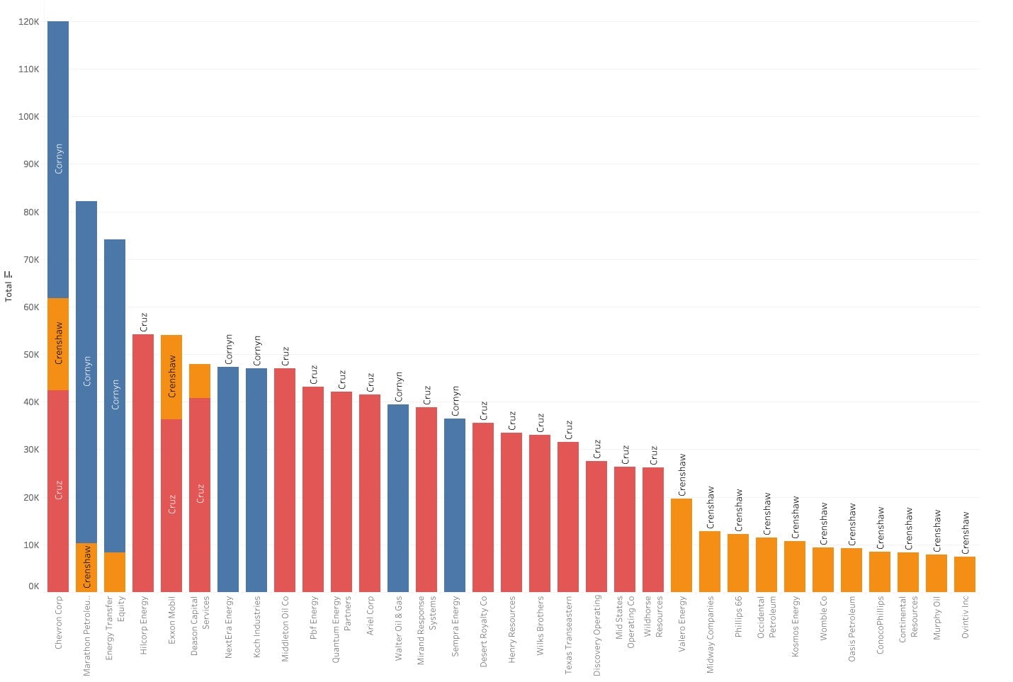 And let’s not forget Lt. Gov. Dan Patrick, who just last week was busy preparing a bill that would blacklist businesses based on their friendliness to fossil fuels. For Texas’ two head honchos, we used individual contributions pulled from state-level data logged on the site Transparency USA, and found some real Easter eggs from the industry.