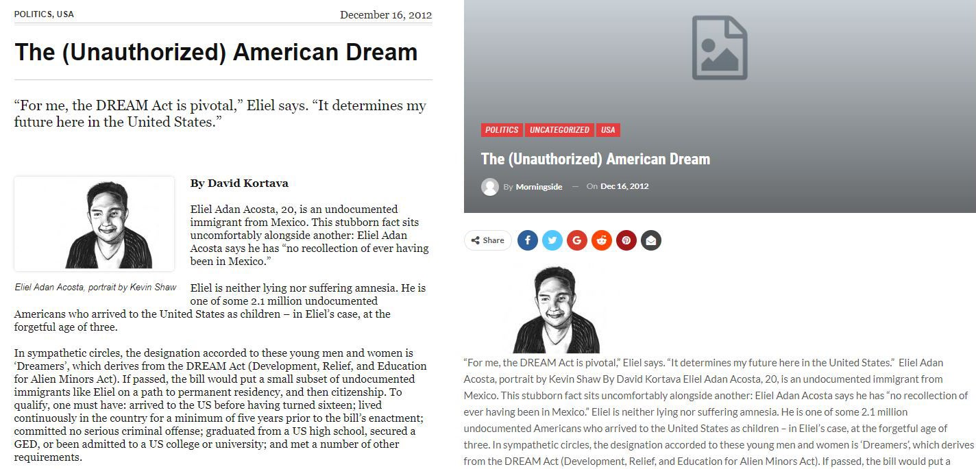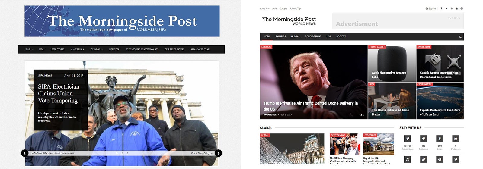 Today, there’s a new visual theme and a new, generic tagline, “World News.” References to Columbia University are gone. The old posts are there, in violation of TMP’s copyright, but, they’re no longer formatted, just ugly walls of texts. Author bylines now read “Morningside,” and later “Writer.” Comments sections are closed, the old comments are deleted.