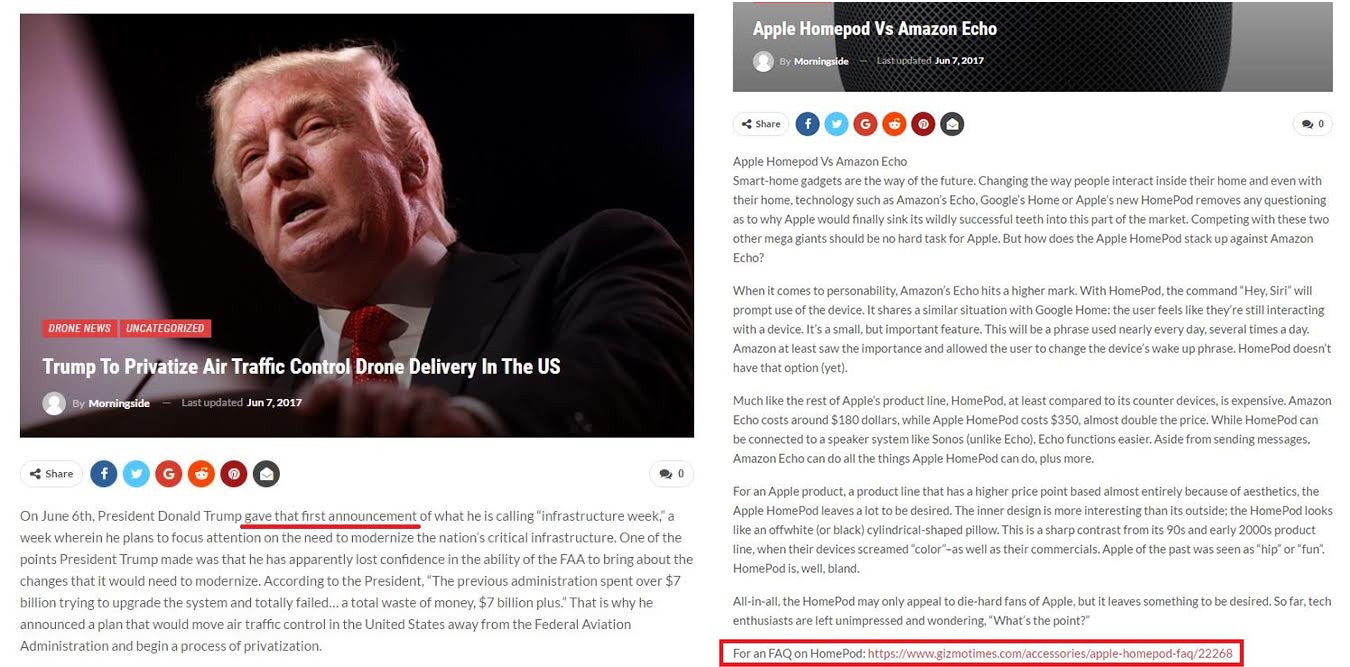 The site’s new owners took one more step to cover their tracks. Gizmodo had reached out to the new owners of the domain through a TMP “Contact Us” form. The next day, on June 7th, 2017, two new posts went up TMP’s site (see above). One, a story involving President Donald Trump and drone policy, included a blatant grammatical error in its opening sentence. The second, comparing Apple and Amazon products, had nothing to do with the content of the site, and included another spammy link (to a site called “Gizmotimes,” as it happens). Two additional posts have gone up since, following the same playbook.