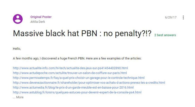Whatever PBN (Private Blog Network) operators are doing, it seems to be working, at least for some. Judging by the chatter on “black hat” SEO forums—as well as on Google’s own support forums—efforts to game the system abound.