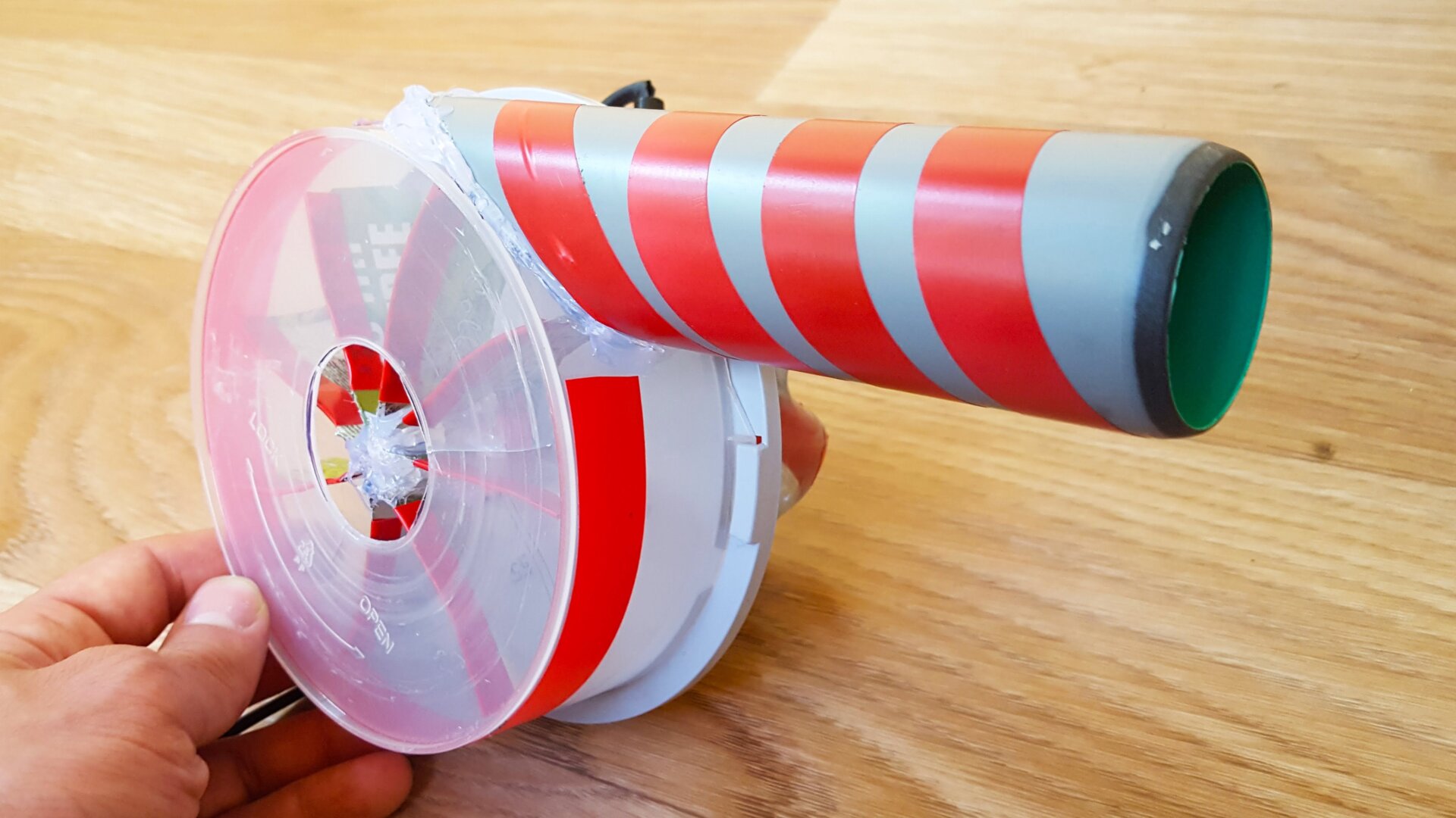 The results are, well, ugly, compared to hair dryers you can buy at a store. And MrGear hasn’t included a heater in his creation, mostly because it’s held together with mountains of glue that would melt causing the blower to fall apart in just a few minutes. So it’s not exactly the ideal way to dry your hair after a morning shower. But hey, at least your desk will be a little cleaner, right?