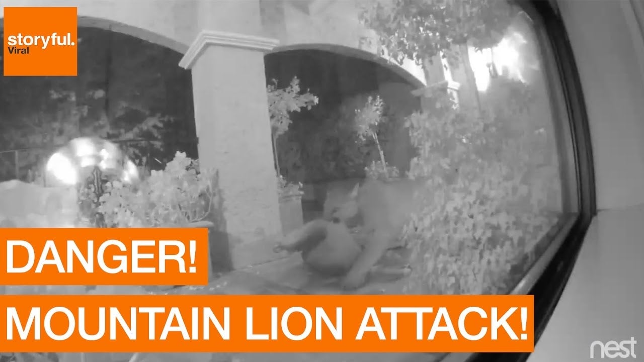 The whole thing was documented on a Nest Cam that was set up to capture any unwanted activity outside the home. In the video, which has been uploaded to YouTube, you can big, glowing eyes from the mountain lion roaming around in the dark. When the homeowner goes to investigate and hits the lights—it reveals not one, but two creatures.