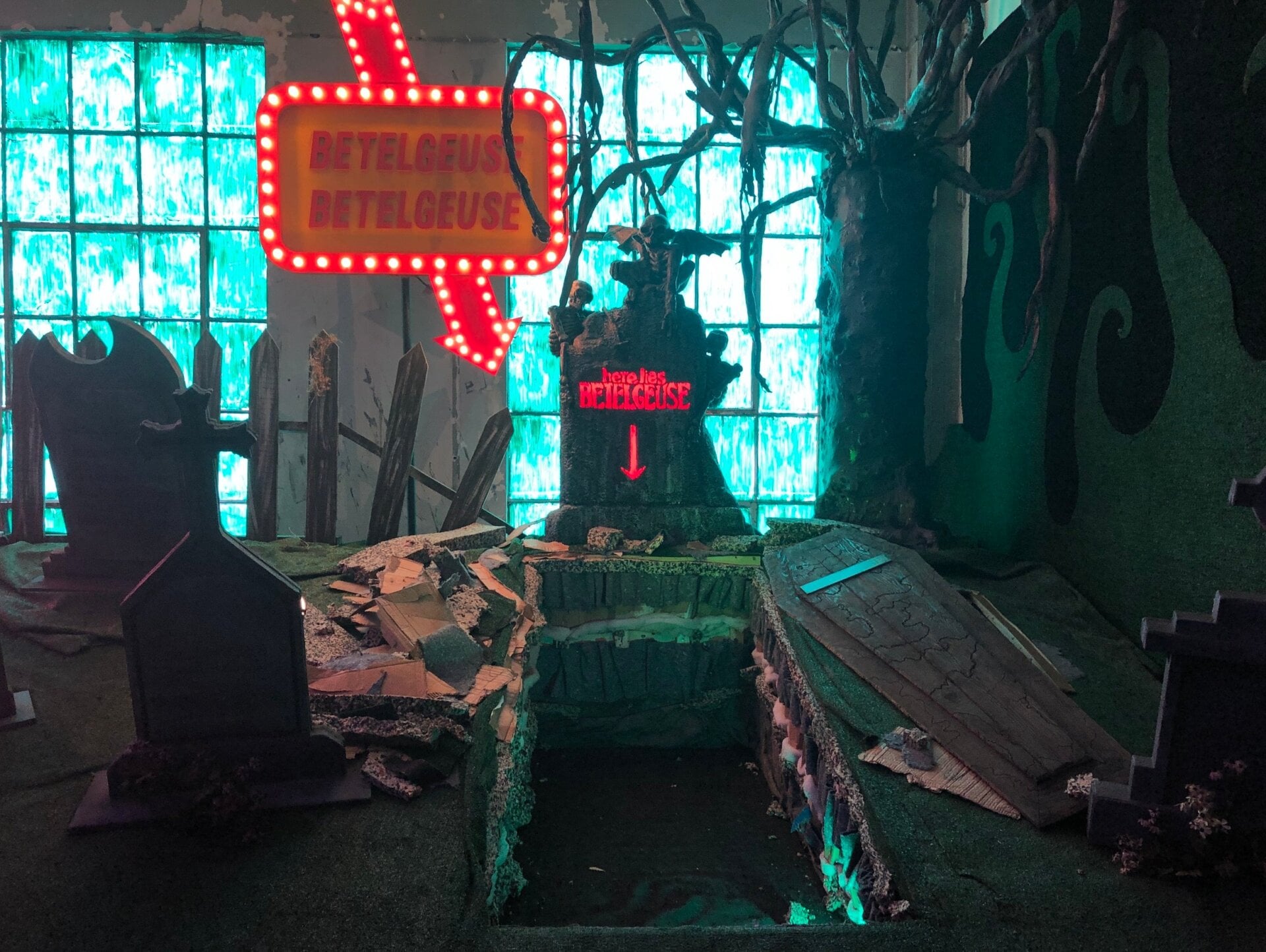Walking to the Beetlejuice section of the exhibit, I couldn’t help but notice a very large line. Appropriately, the line is for a section where the exhibit recreates the afterlife waiting room. I didn’t wait to see that (but it must be good if it had a line), but was still satisfied by the section, thanks in large part to its awesome grave and fun house pieces, both of which look like they were straight out of the movie.