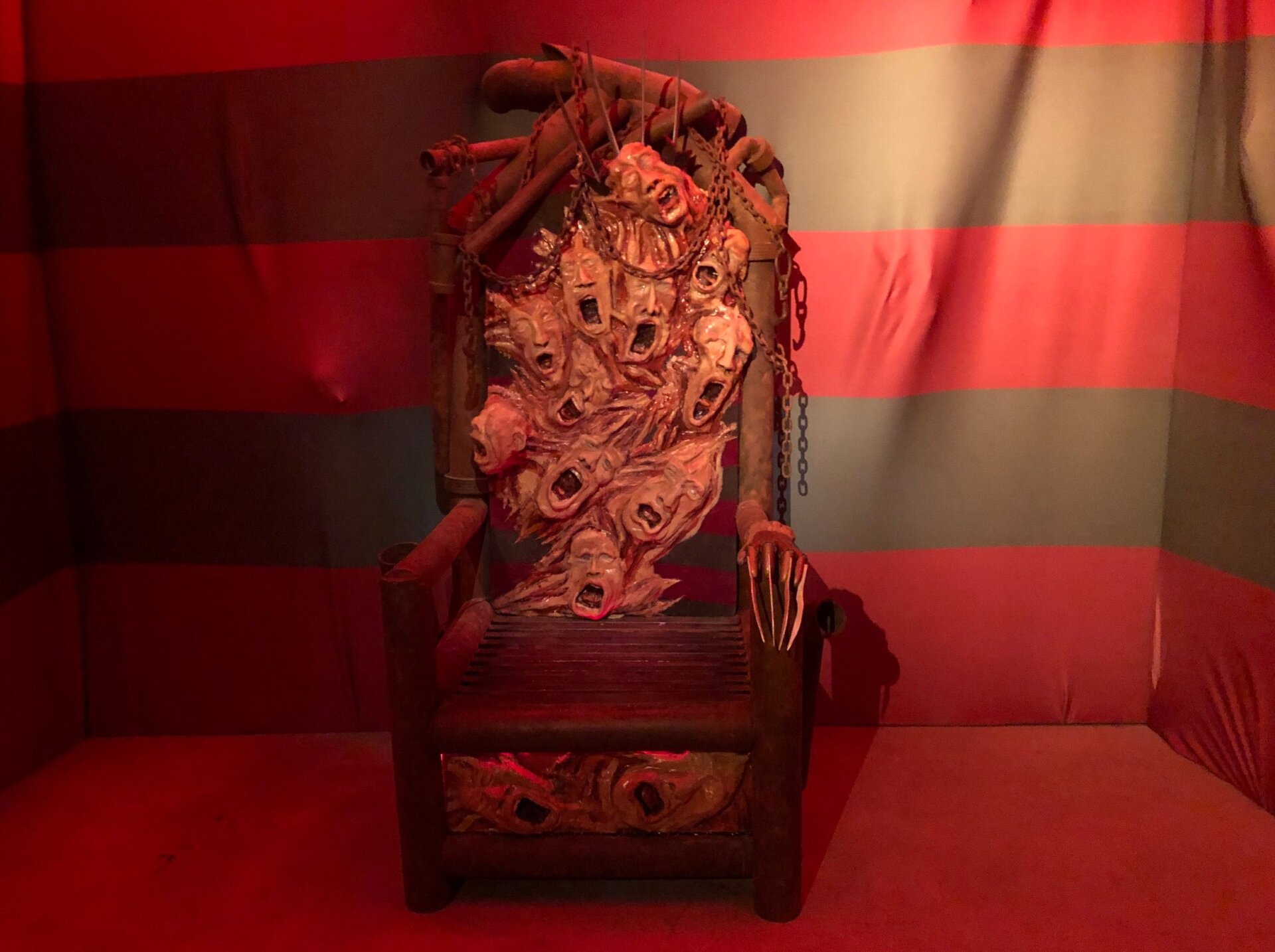 The Nightmare on Elm Street section of the exhibit is by far the smallest one, but what it lacks in quantity, it makes up for in quality. There’s the eerie Freddy throne, complete with a razor glove you can pose with, as well as a massive razor glove you can stand under for an even scarier photo op. Each element is absolutely gorgeous, in the most disturbing ways possible.