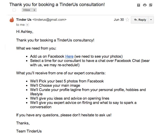 Upon signing up for TinderUs—or more specifically, after TinderUs collects 50 of your hard-earned dollars—you receive the following email: