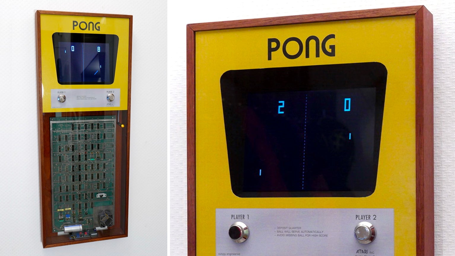Instead of perfectly recreating the cabinet of a 1972 Pong arcade cabinet, Müller created a two-inch-thick frame that contained the original mainboard (protected behind a sheet of clear plexiglass) as well as a recreation of its screen and controls. No one wants to undertake the extreme engineering challenge of mounting an era-authentic heavy CRT screen to a wall, so Müller replaced it with a flat, eight-inch TFT panel. But to recreate the effect of an old-school CRT screen, a homebrew FPGA-based upscaler acts as an interface between the original Pong circuit board and the TFT display, adding simulated “scan lines, horizontal blur, and some phosphor afterglow” so gameplay looks far more authentic.