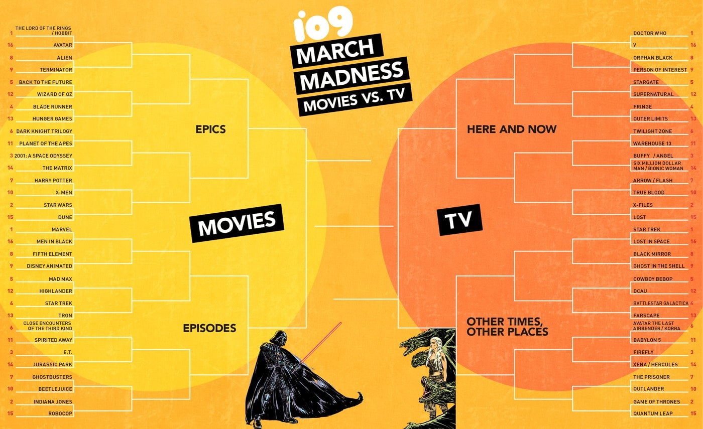 It’s that time again: io9’s March Madness. In past years, we’ve crowned the best movie, the worst movie, the best TV show, and a winner in an epic science fiction versus fantasy showdown. This year, we’re figuring out which medium has produced the best work: film or television.