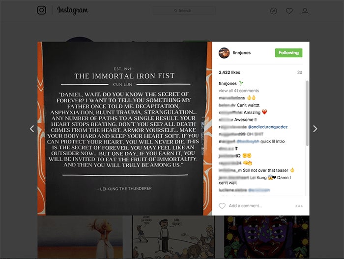Finn Jones revealed this quote from Danny’s mentor Lei Kung the Thunderer in the show. It may seem innocuous, but the Instagram post has since been a deleted, implying there might be something here the show isn’t quite ready to reveal. [Monkeys Fighting Robots]