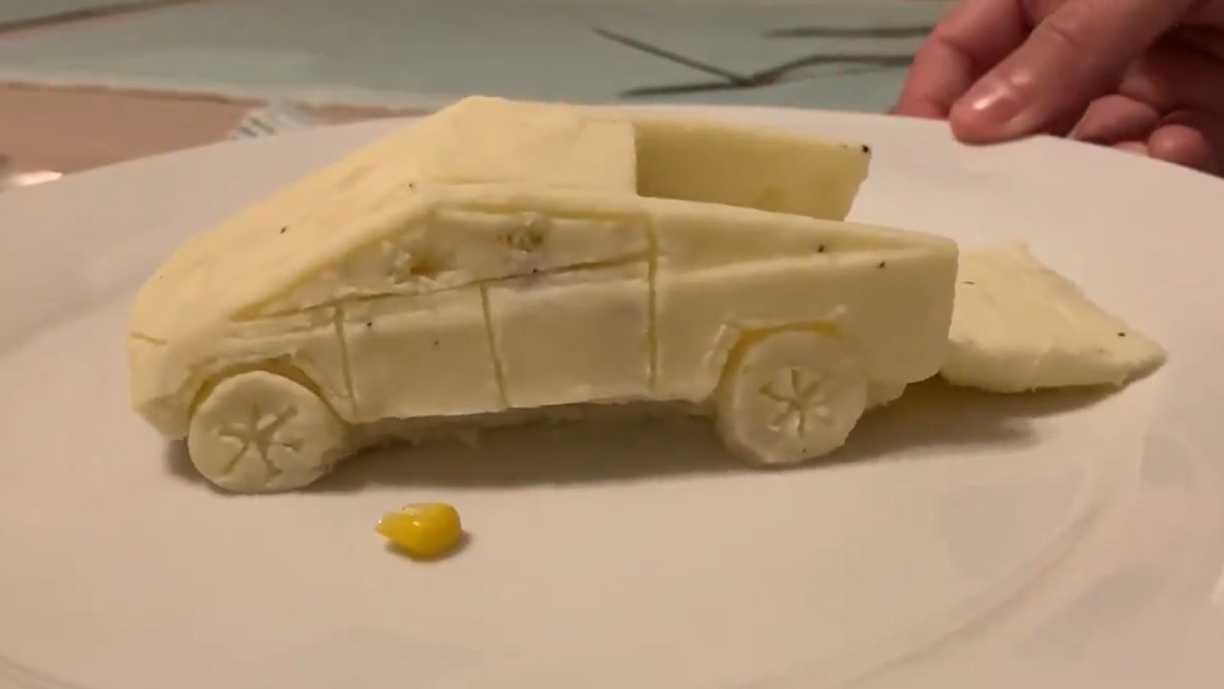The feat wasn’t small potatoes either: It took over an hour to carve out Elon Musk’s new baby, including puncturing a few holes in its “windows” in a starchy recreation of the infamous snafu at its reveal where lead designer Franz von Holzhausen smashed its supposedly shatterproof glass with a metal ball.