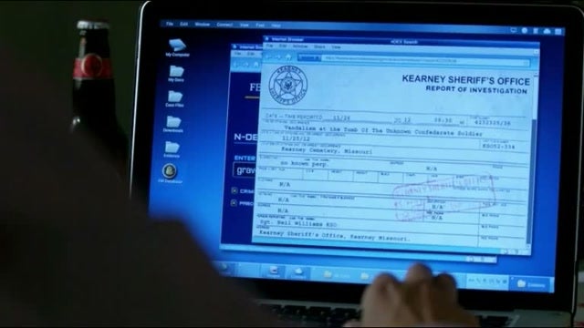 Sam and Dean show up, find Garth there doing Bobby’s old job (cue at least 40 minutes of “you’re no Bobby” from Dean), and figure out that everybody is being gunked by a spectre. You can tell when they’ve been gunked because green slime bubbles out of their ears and a guy in a seriously bad wig and zombie Confederate costume crackles behind their faces in that TV-static style that all ghosts have adopted since seeing The Ring. Turns out some kids disturbed the grave of the unknown Confederate soldier, who fought on the other side of the war from his brother . . . Missouri was on the border so brother fought brother . . . Civil War . . . humina humina . . . spectre now unleashed on the world to gunk people into acting on their pent-up feelings of political alienation from those damn liberals who run the government.
