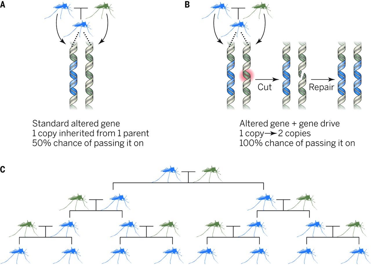 On average, genes have about a 50 percent chance of being inherited, but some preferential genes can be altered to have a heightened chance of being passed on. These genes can still proliferate in a population even if they reduce a species’ overall reproductive potential. Scientists would like to genetically modify animals in the wild by adding, removing, or introducing entirely new traits and capacities. Obviously, scientists can’t go out and physically modify each and every animal, but they can “drive” a gene through the population using a select number of transgenic organisms created in the lab.