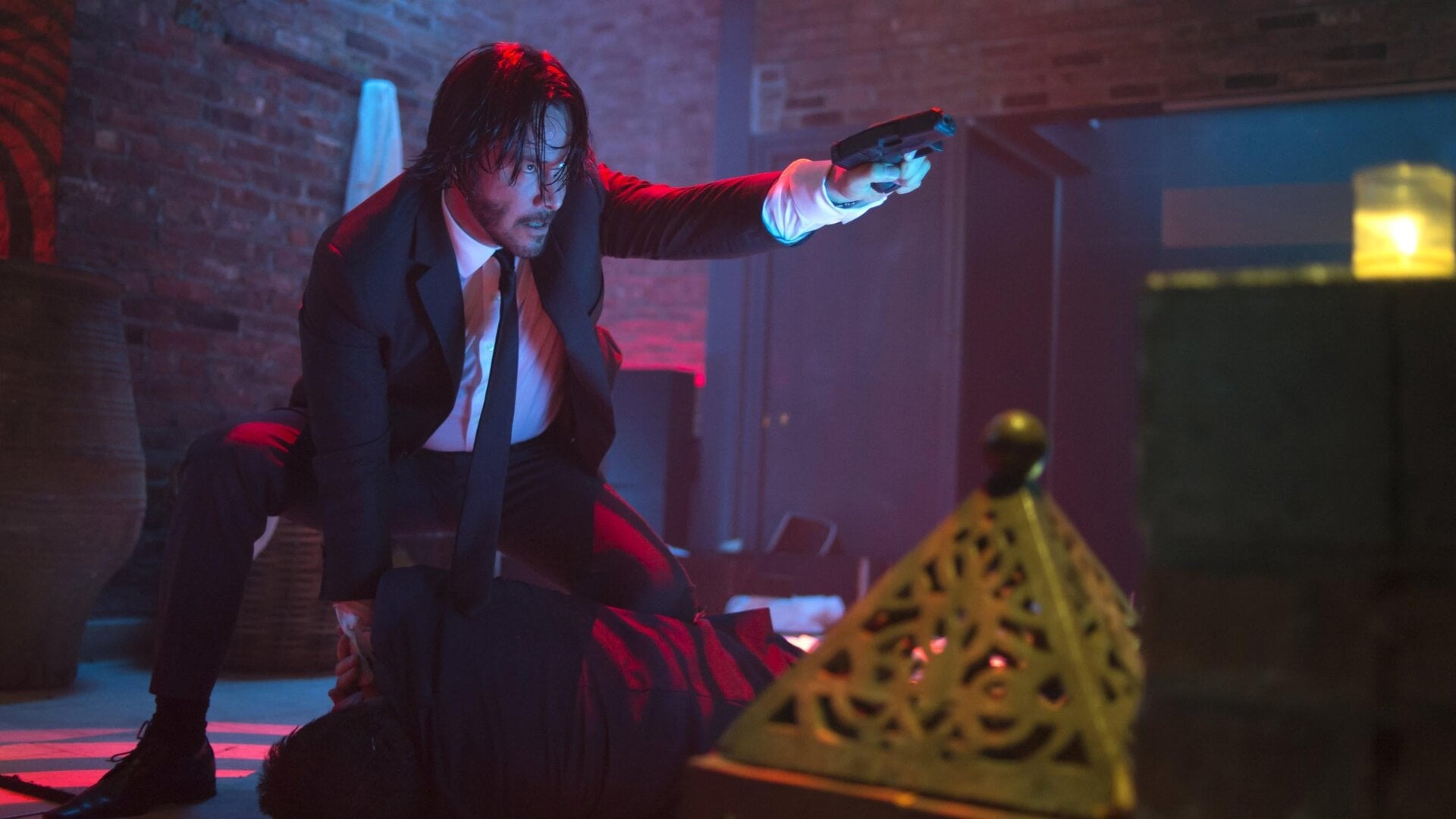 John Wick answers the door to his home, lights and sirens clearly visible outside. Wick isn’t bothered, half-covered behind the door, a gun clutched in his hand, held at the small of his back. A cop stands a respectful distance away from the door, turns his head, looks past Wick and sees bodies–not a body, multiple bodies–in the front hallway. He leans back.